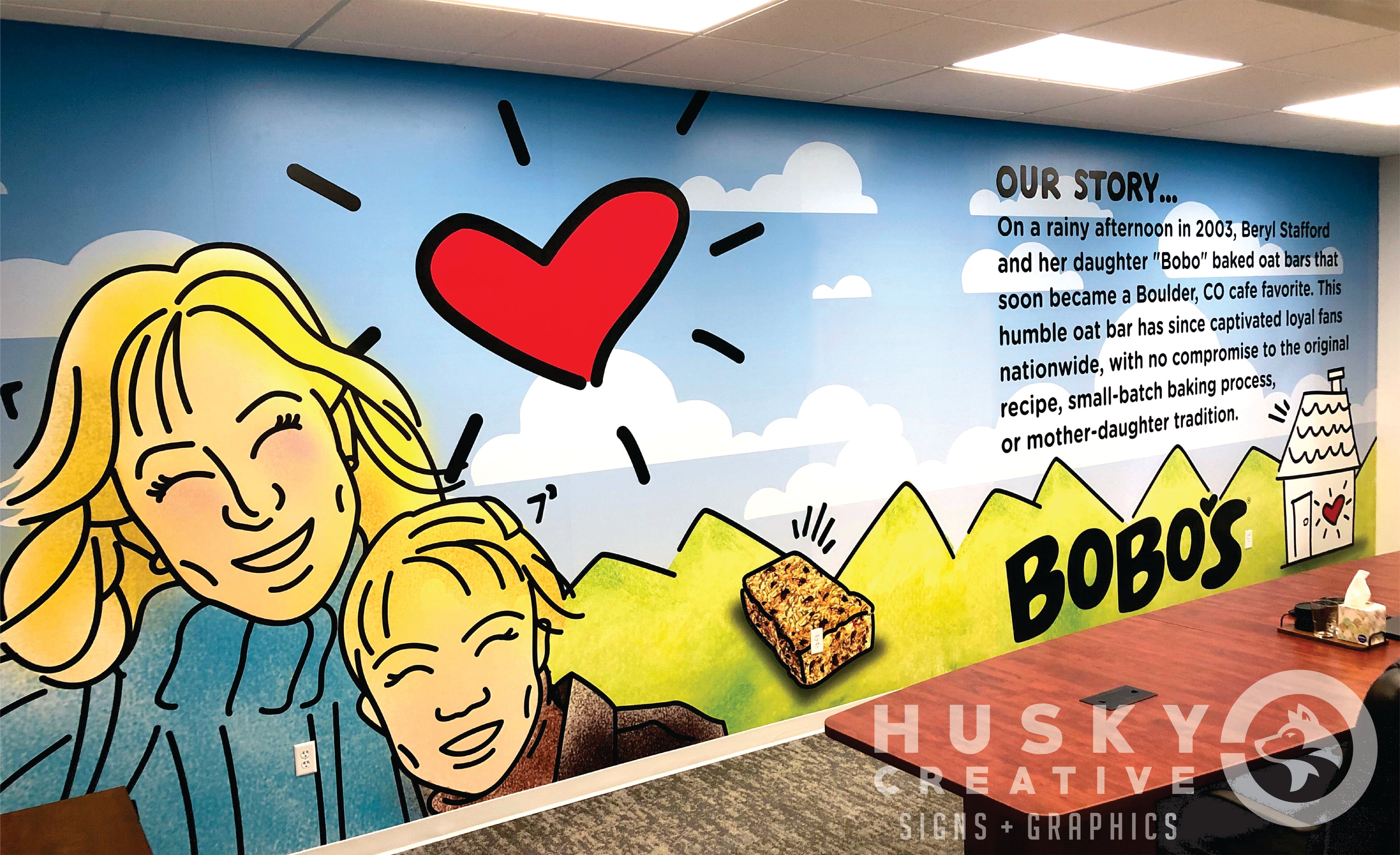 BoBo’s has been warming the hearts of all those who have enjoyed their incredible oat bars since 2003. With humble beginnings in Boulder, CO, BoBo’s discovered Husky Signs right down the street from them. Since their early days, Husky Signs and BoBo’s have collaborated on so many sign and vinyl projects that we have lost count. From vehicle and large truck wraps to small spot graphics, specialty wraps like their demo toasters, facility wall wraps, wall signs, and exterior signs, we have done it all for them. We LOVE BoBo’s!